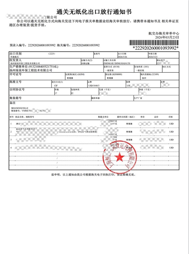 Se pare că termenul pentru această livrare a fost atât strâns, cât și foarte eficient. Pe 22, echipamentul a fost ridicat cu succes și încărcat imediat pe o navă în aceeași zi. Ulterior, transportatorul a pornit cu succes pe 26, transportând echipamentul în Cambodgia pe cale navigabilă. Această livrare nu numai că demonstrează capacitățile de execuție extrem de eficiente ale Lvquan Environmental în managementul logisticii transfrontalier, dar demonstrează și poziția sa tehnologică de lider în domeniul tratării gazelor reziduale industriale pentru industria tipografică.