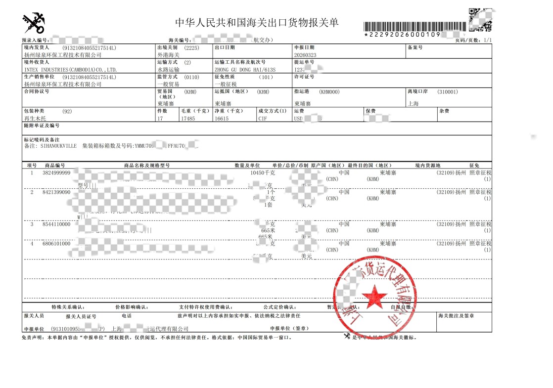 Vezi detalii[Phnom Penh, Cambodgia, 22 martie 2026] — Lvquan Environmental Protection Engineering Technology Co., Ltd. a finalizat recent cu succes o livrare transfrontalieră semnificativă, furnizând un set de echipamente avansate de imprimare pentru tratarea gazelor de eșapament clientului său cambodgian, INTEX INDUSTRIES (CAMBODIA) CO., LTD.